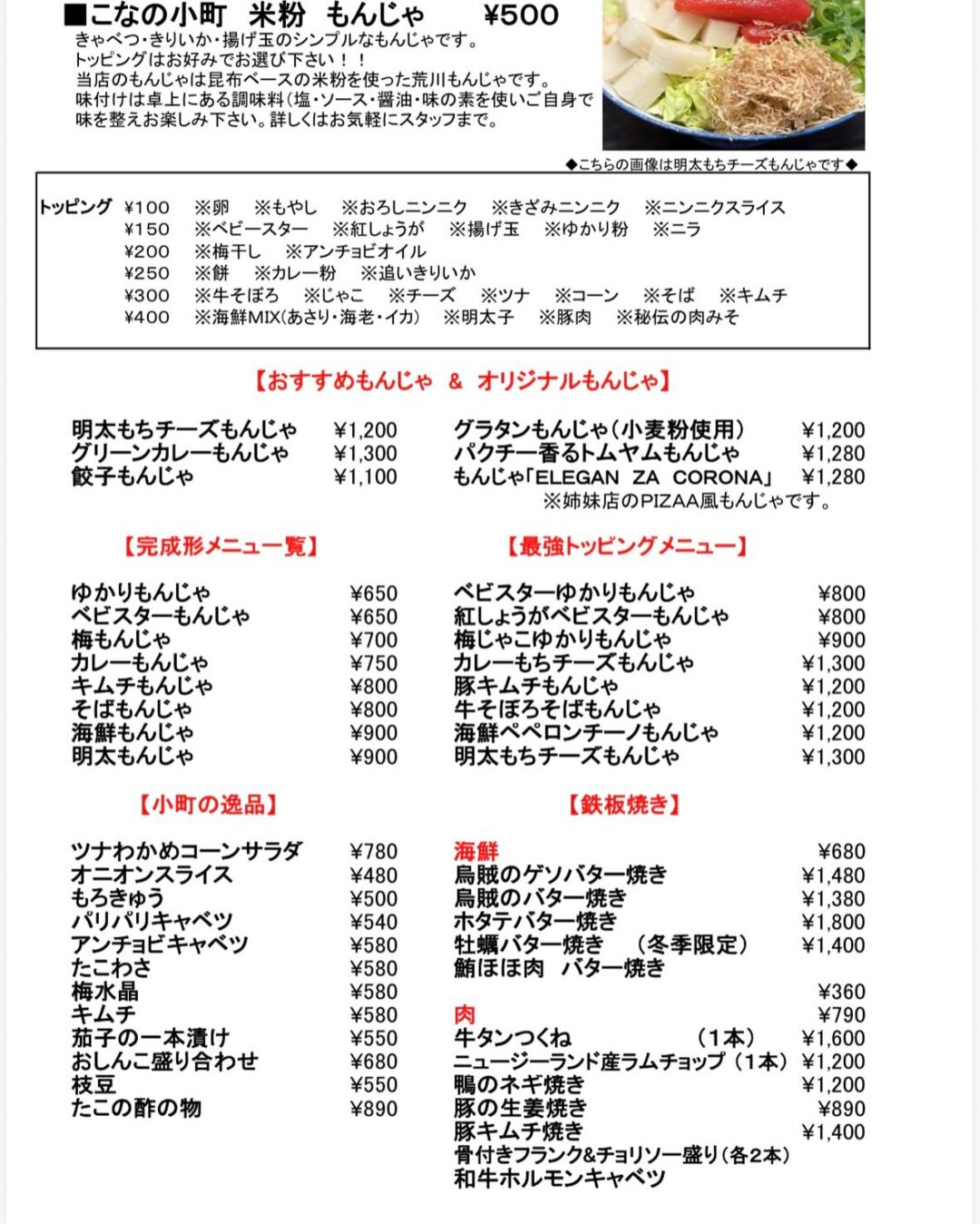 ◇こなの小町よりグランドメニューの紹介です◇ ◇こなの小町よりグランドメニューの紹介です◇ 米粉のもんじゃは¥500より お好みのトッピングでお楽しみ下さい 鮪頬肉バターポン酢 ¥1,400 宮崎牛ステーキ ¥2,400 は絶品です! スキル 投稿日 2026年3月9日 ← ◇荒川もんじゃ こなの小町◇開店のお知らせ . →